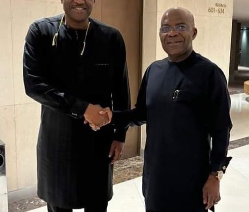 The Managing Director/CEO of the Nigerian Education Loan Fund (NELFUND), Mr Akintunde Sawyerr with Executive Governor of Abia State, Mr Alex Otti, right, on Thursday after a brief meeting in Abuja.