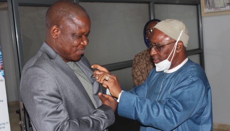 The President ACCI, Dr. Al-Mujtaba Right decorating the newly inaugurated Chairman of Transport Trade Group, Mr. Olawale Rasheed Wednesday.
