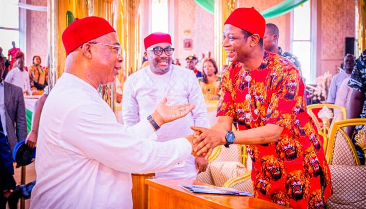 Imo State Governor, Senator Hope Uzodimma exchange pleasantries with NCPC Executive Secretary, Rev Pam, right