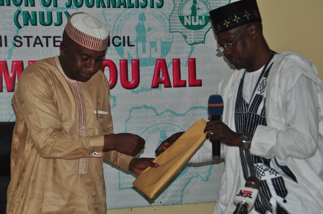 Inuwa Bello (right) submits his committee reports to NUJ Chairman, Umar Said