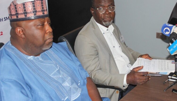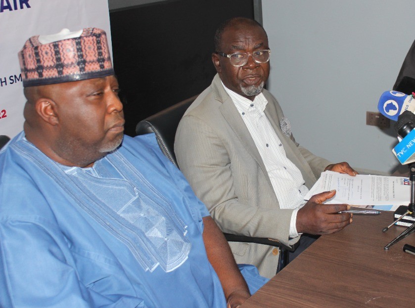 ACCI Vice President, Mines, and Chairman, National Chamber of Commerce Trade Centre (NCCTC), Dr. Anene with representative of the FCT Minister, Secretary, Economic Planning, Revenue Generation and PPP for FCT Administration, Hon. Agboola Dabiri, left at the press briefing Wednesday