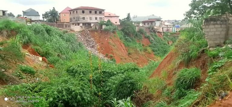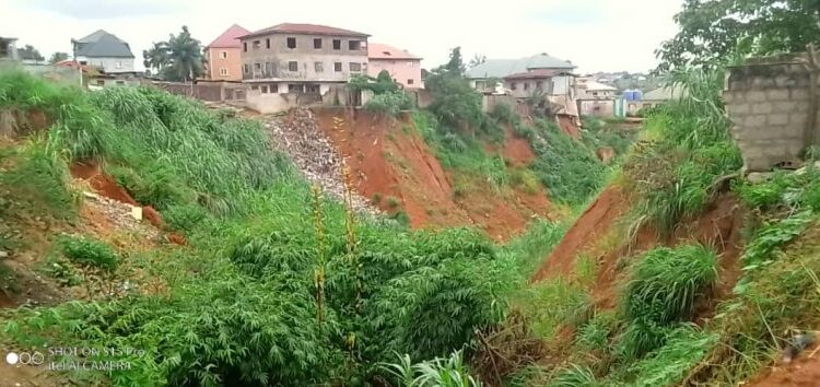 Our Correspondent who visited the site gathered that a 3-storey building constructed close to the gully at Nkisi-Aroli Street caved-in three years ago and since then the erosion had kept expanding.