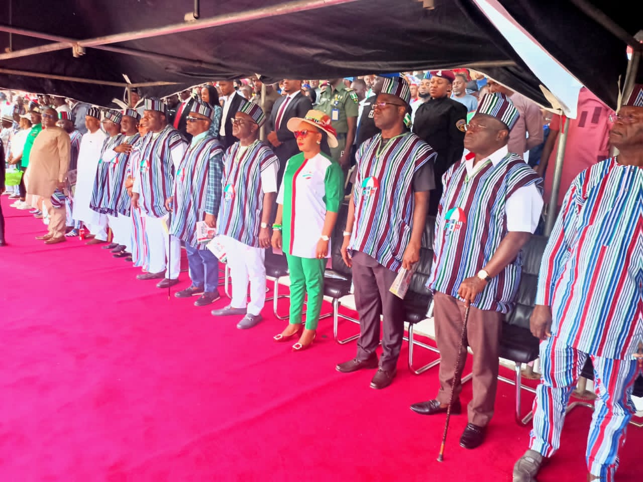 Acting State Chairman of the PDP, Hon Isaac Mffo presented the party’s flag to the Governorship candidate, Engr Titus Uba and his running mate, John Ngbede and the three Senatorial candidates of the party, Governor Ortom, Senators Suswam and Abba Moro and charged them to remain committed to the victory of the party at the polls.