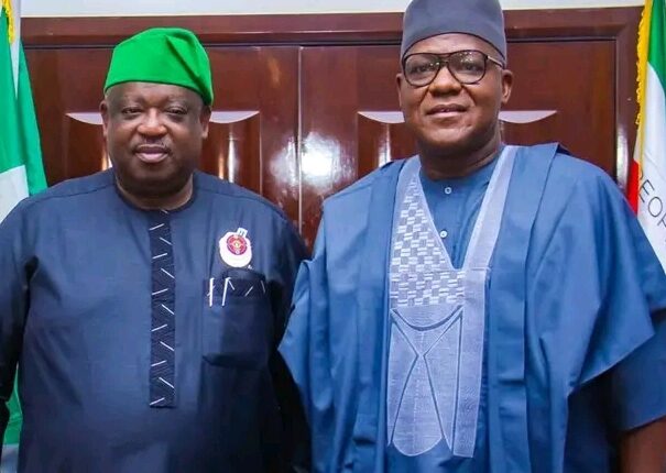 Former Speaker, House of Representatives, Rt. Hon. Yakubu Dogara with Governor of Plateau State, Caleb Mutfwang, left