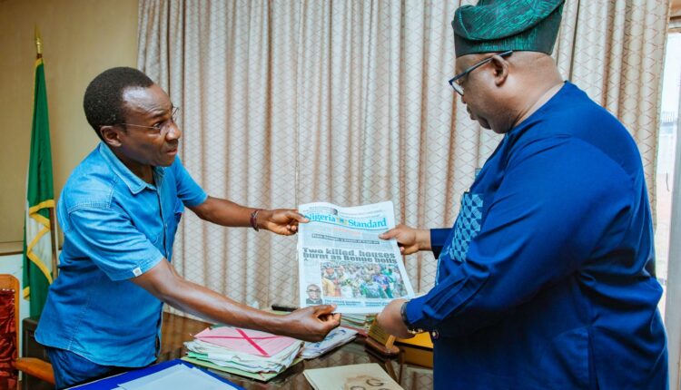 General Manager, Plateau Publishing Corporation, Mr. Chris Gyang, left, presents a copy of The Nigerian Standard newspaper to Governor Caleb Mutfwang