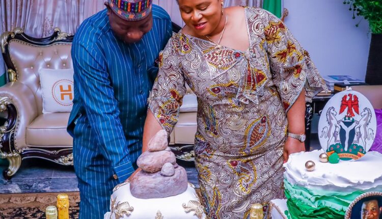 Governor Lalong cuts his birthday cake assisted by his wife, Regina