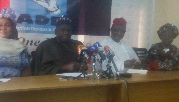 From left: Director-General, ADP presidential campaign, Irelu Kemi Elebute-Halle, the party’s presidential candidate, Engineer Yabagi Yusuf Sani, National Organising Secretary, Dr. Alexus Maiyanga and Deputy National Women Leader at the media briefing