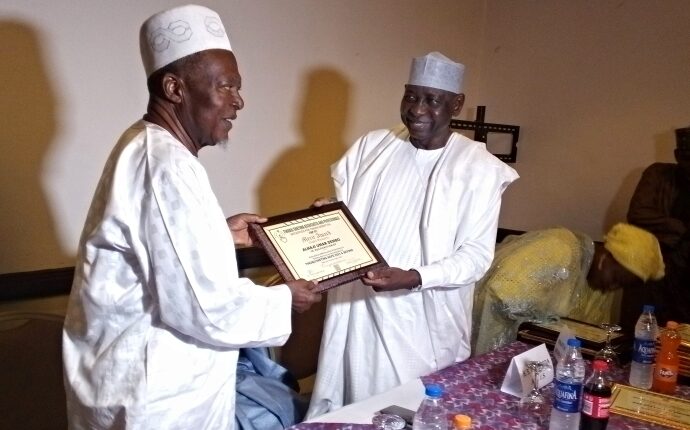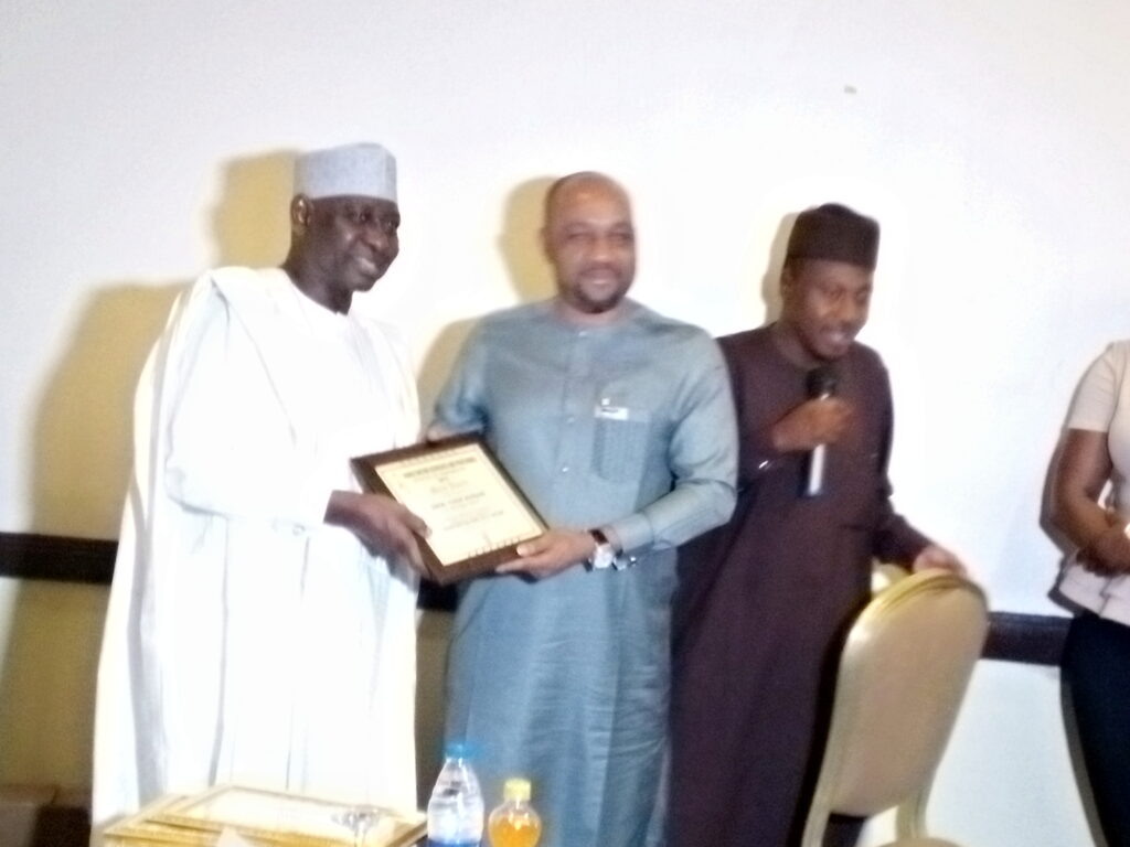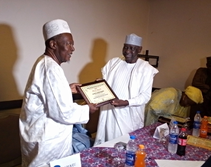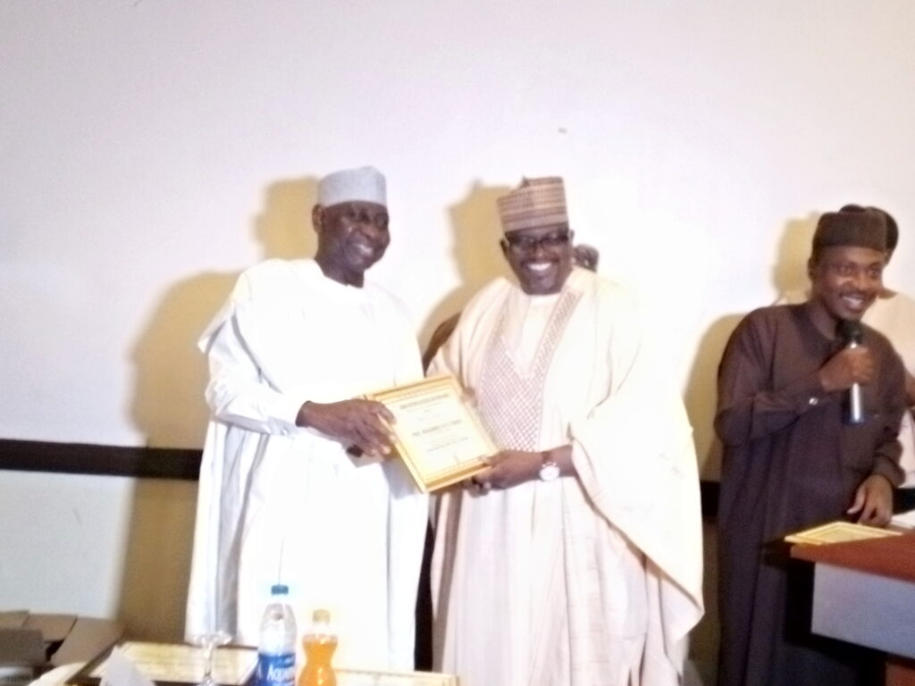Former Minister of State for Petroleum, Alhaji Umaru Dembo, left, presents a plaque of award to former Governor of Zamfara State, Alhaji Mahmoud Aliyu Shinkafi at the occasion