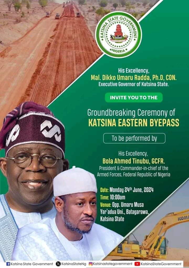 Also, he is to perform the groundbreaking of the construction of the new Katsina Eastern Bypass that spans from Dutsinma Road to Kano Road, passing through Daura Road, and ultimately ending at Yandaki Village in Kaita Local Government.