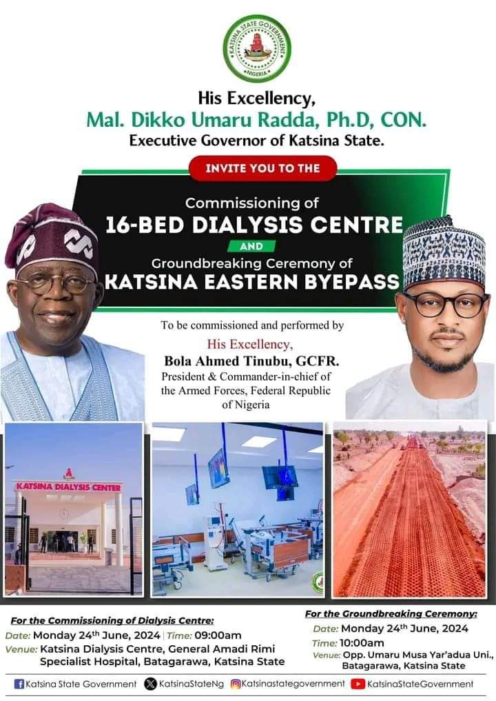 President Tinubu is also expected to commission a state-of-the-art ultramodern 16-bed dialysis center, a significant healthcare project initiated by Governor Dikko Umaru Radda at General Amadi Rimi Specialist Hospital, Batagarawa.