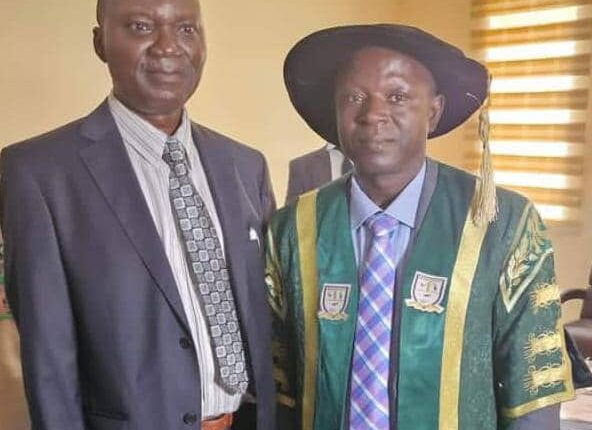 Professor William Barnabas Qurix with new Bingham University Vice Chancellor, Professor Haruna Kuje Ayuba, right