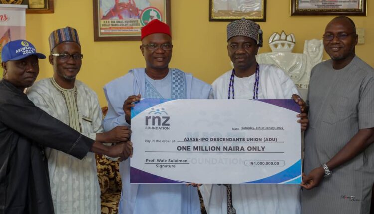 Prof. Wale Sulaiman, the Asiwaju Ewe of Ajase-Ipo Land and President RNZ Foundation on behalf of his foundation and the progressive Asiwaju Ewe Movement (2023) has donated N1 million towards the construction of the Ajase-Ipo Descendants Union (ADU) National Secretariat at Ajase-Ipo.