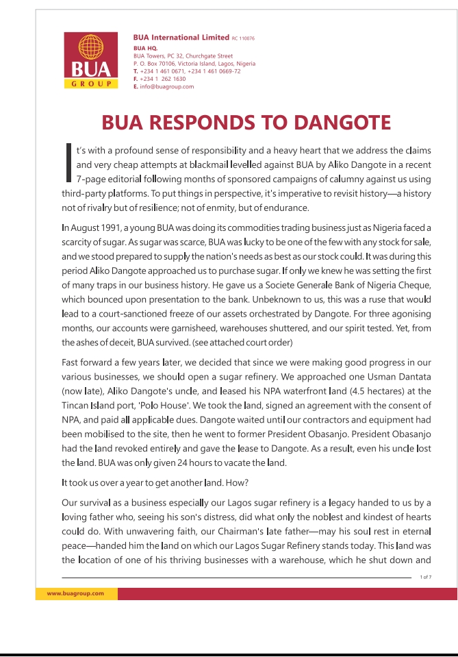 Responds revealed how BUA survived Dangote’s machinations, traps, selfish plots, use of unscrupulous government officials to foist monopoly since 1991-date