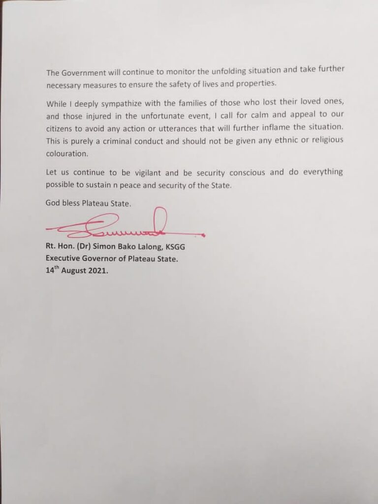 In order to avoid further deterioration of the situation and to protect lives and properties of citizens, I have directed the imposition of curfew on Jos North, Bassa and Jos South Local Governments commencing 6pm to 6am from today, 14th August 2021.