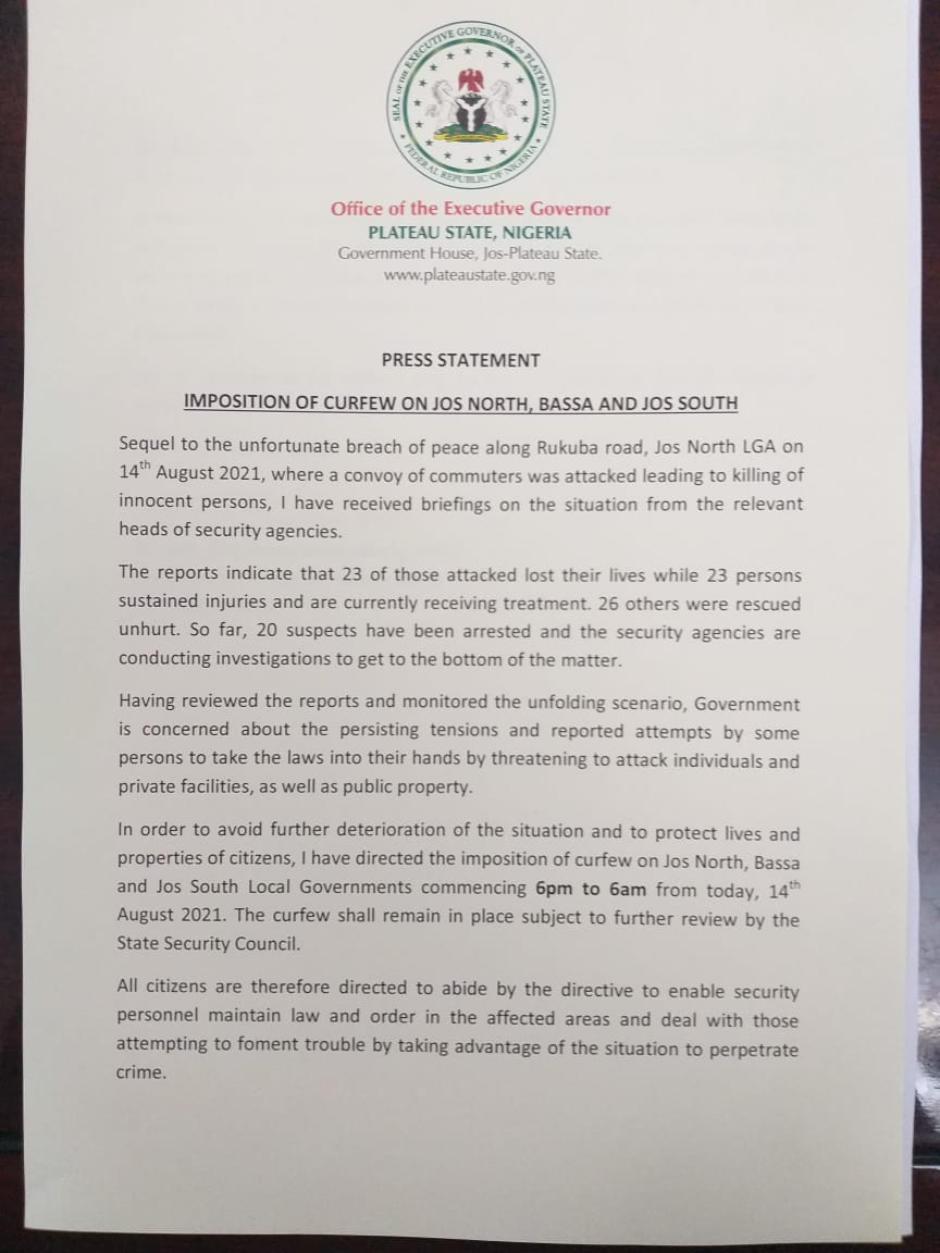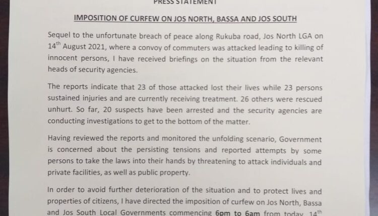 The Plateau State Government has imposed a curfew from 6pm to 6am from Saturday August, 14, 2021 on Jos North, Bassa and Jos South local government areas following an attack along Rukuba Road leading to the death of 23 persons.