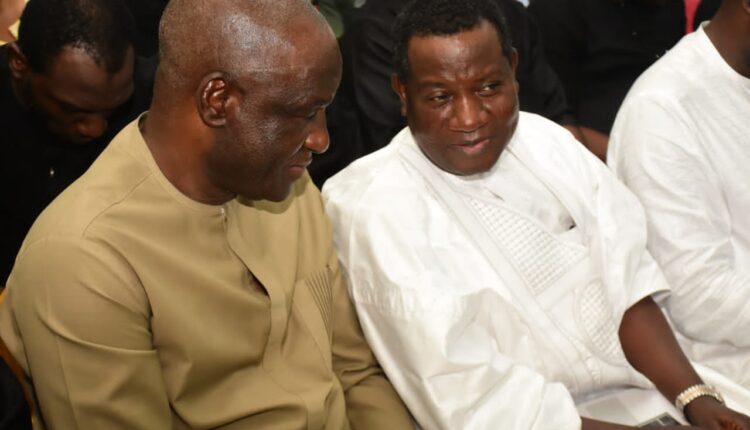 Senator Lalong, right, shares a thought with a sympathiser at the requiem Mass