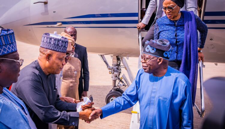 Vice President-Elect, Senator Kashim Shettima welcomes President-Elect, Asiwaju Bola Ahmed Tinubu back to Nigeria at the Presidential Wing, Nnamdi Azikiwe International Airport, Abuja, Saturday.
