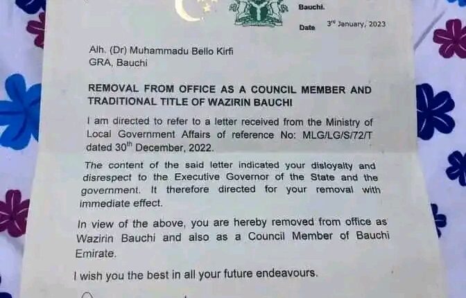 According to the letter of the removal with reference number, BEC/ADM/20/VOL.XV from the Bauchi Emirate Council dated 3rd January, 2023 addressed to Alh. (Dr) Muhammadu Bello Kirfi GRA, Bauchi is titled, ‘Removal From Office as a Council Member and Traditional Title of Wazirin Bauchi.’