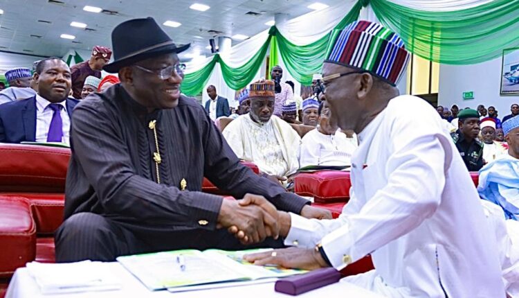 Governor Ortom greets former President Goodluck Jonathan, left, at the ceremony