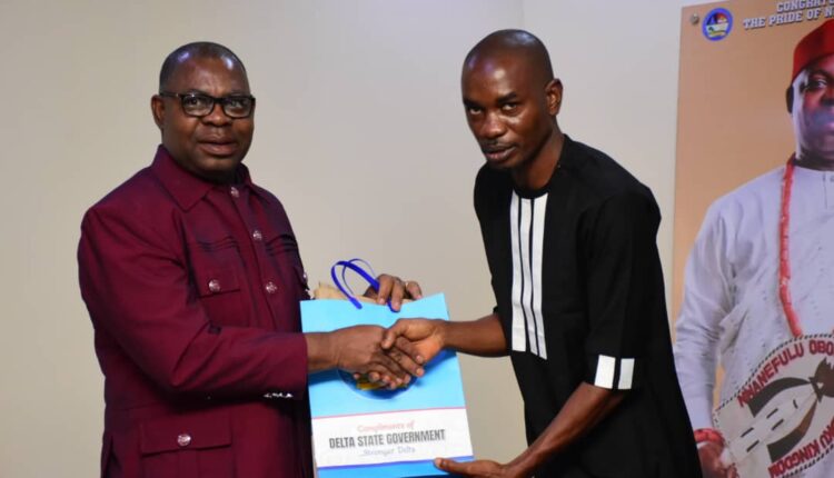 Deputy Governor of Delta State, Sir Monday Onyeme (left) presenting gift to the President of Ndokwa Youth Leaders Association, Comrade Ernest Enebeli when the latter led members of his association to pay him a courtesy visit on Monday